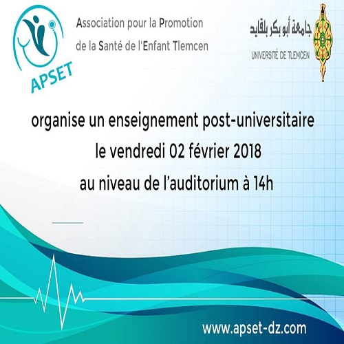 L’association pour la promotion de la santé de l’enfant "APSET" en collaboration avec la faculté de médecine Dr B. Benzerdjeb de Tlemcen, organise un enseignement post-universitaire le vendredi 02 février 2018 au niveau de l’auditorium à 14h, cet enseignement portera…